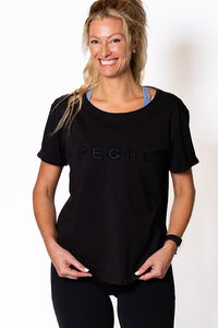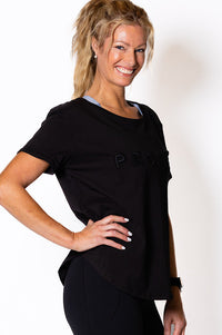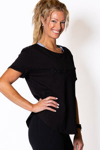 Perky Scoop Hem T-Shirt - Black with Black embroidery